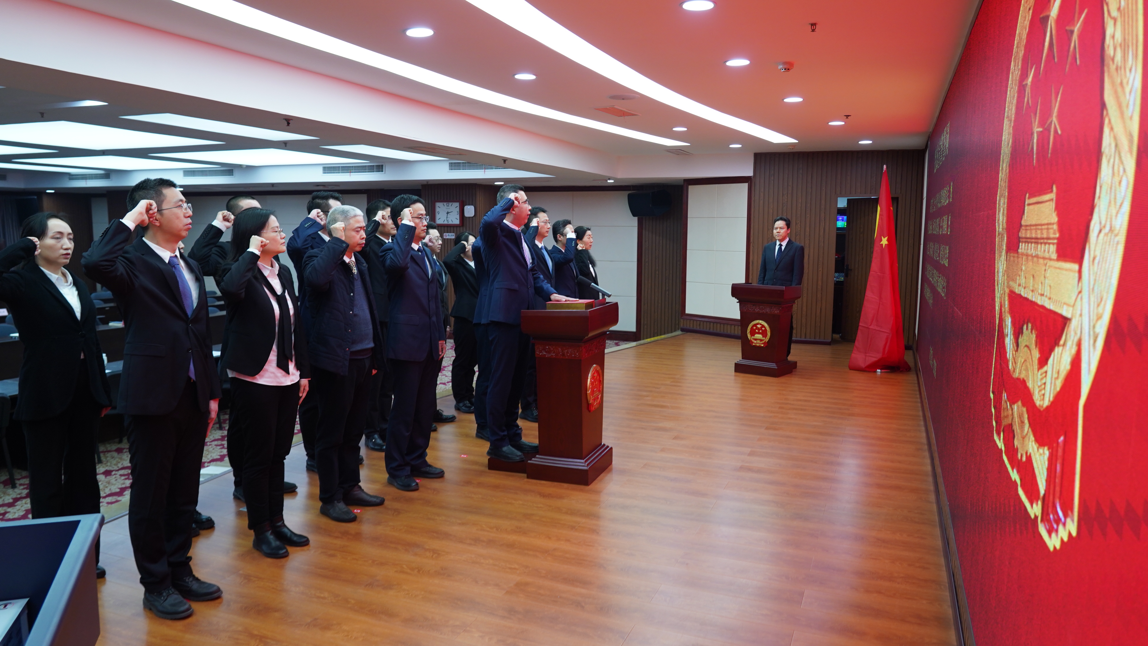 宪法宣誓在庄严的国歌声中开始,18新提任的处级领导干部整齐肃立、面向国徽,高举右拳、庄严宣誓,作出忠于宪法、忠于祖国、忠于人民的郑重承诺。